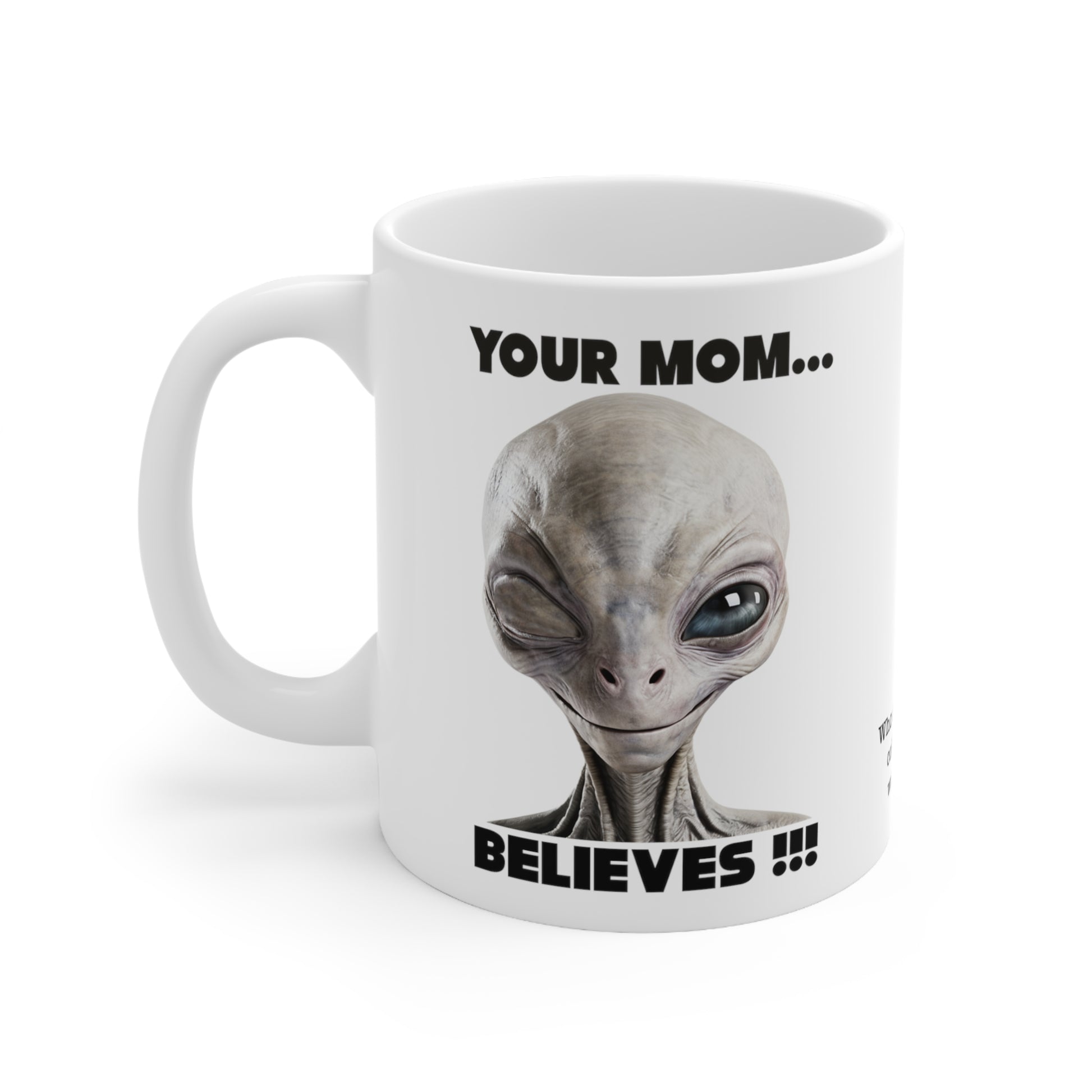Unveil the cosmic conspiracy with our "Your Mom Believes" Coffee Mug! 👽✨