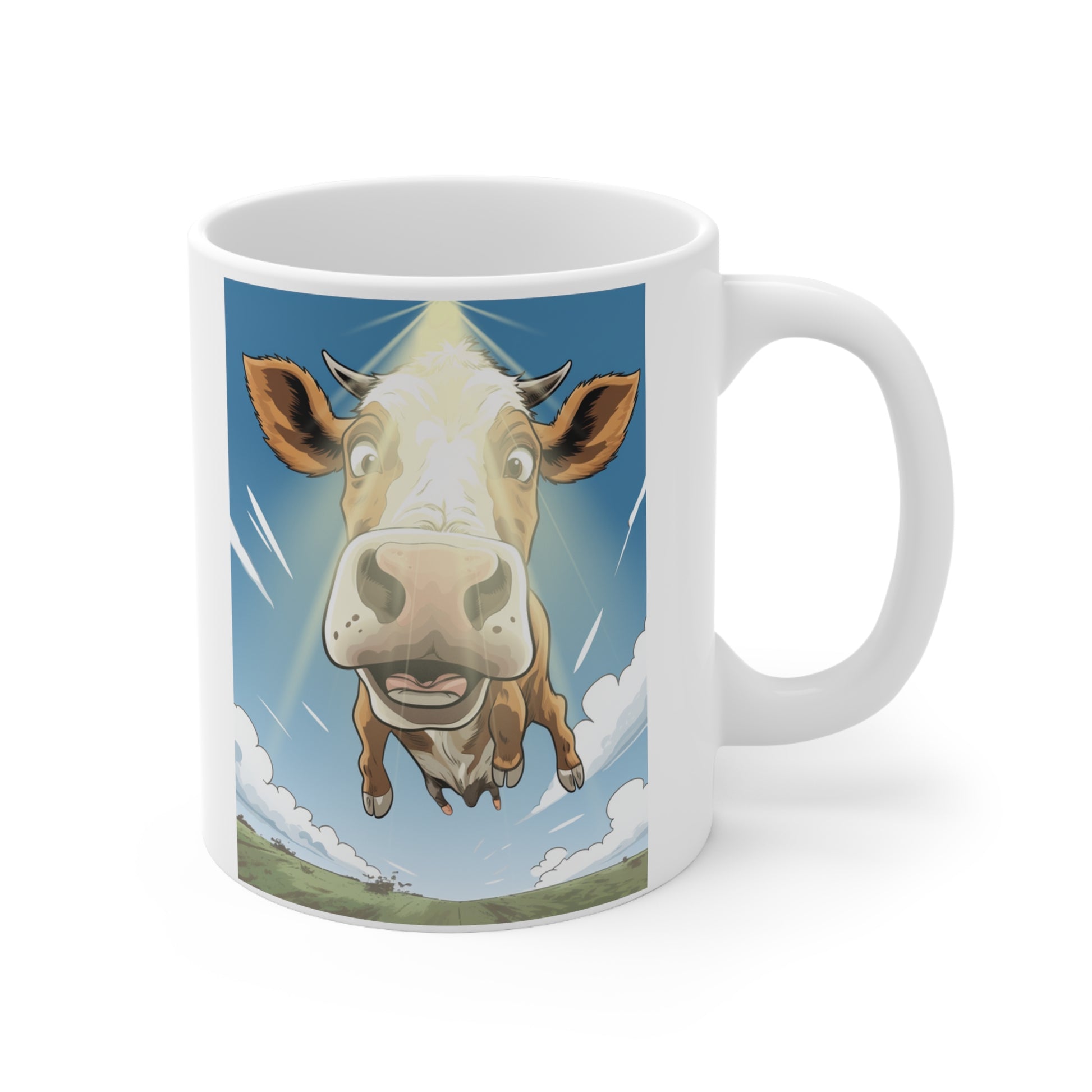 But that's not all – flip the mug around, and you'll witness a whimsical scene of a bewildered cow being beamed up by a tractor beam, showcasing the absurdity of intergalactic encounters. It's a visual spectacle that's bound to spark conversations and laughter among your fellow coffee enthusiasts.
