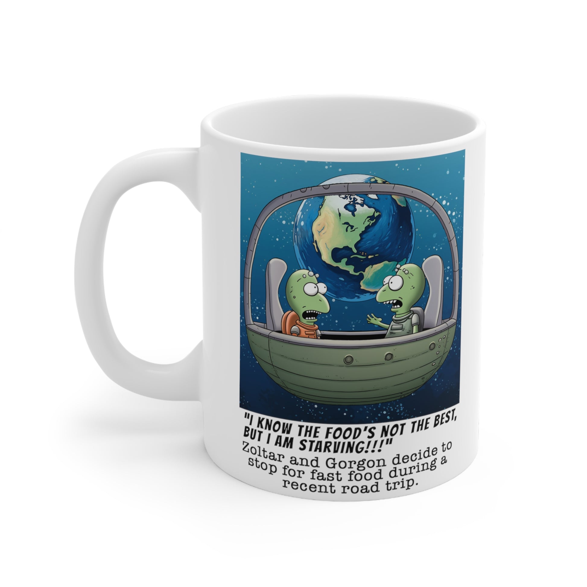 Get ready for a journey through the cosmos with our out-of-this-world coffee mug! On one side, you'll find two quirky aliens locked in a heated debate, contemplating whether to make a pit stop for some "fast-food" on planet Earth, despite their long interstellar road ahead. Their comical expressions and witty banter are sure to leave you chuckling with every sip.
