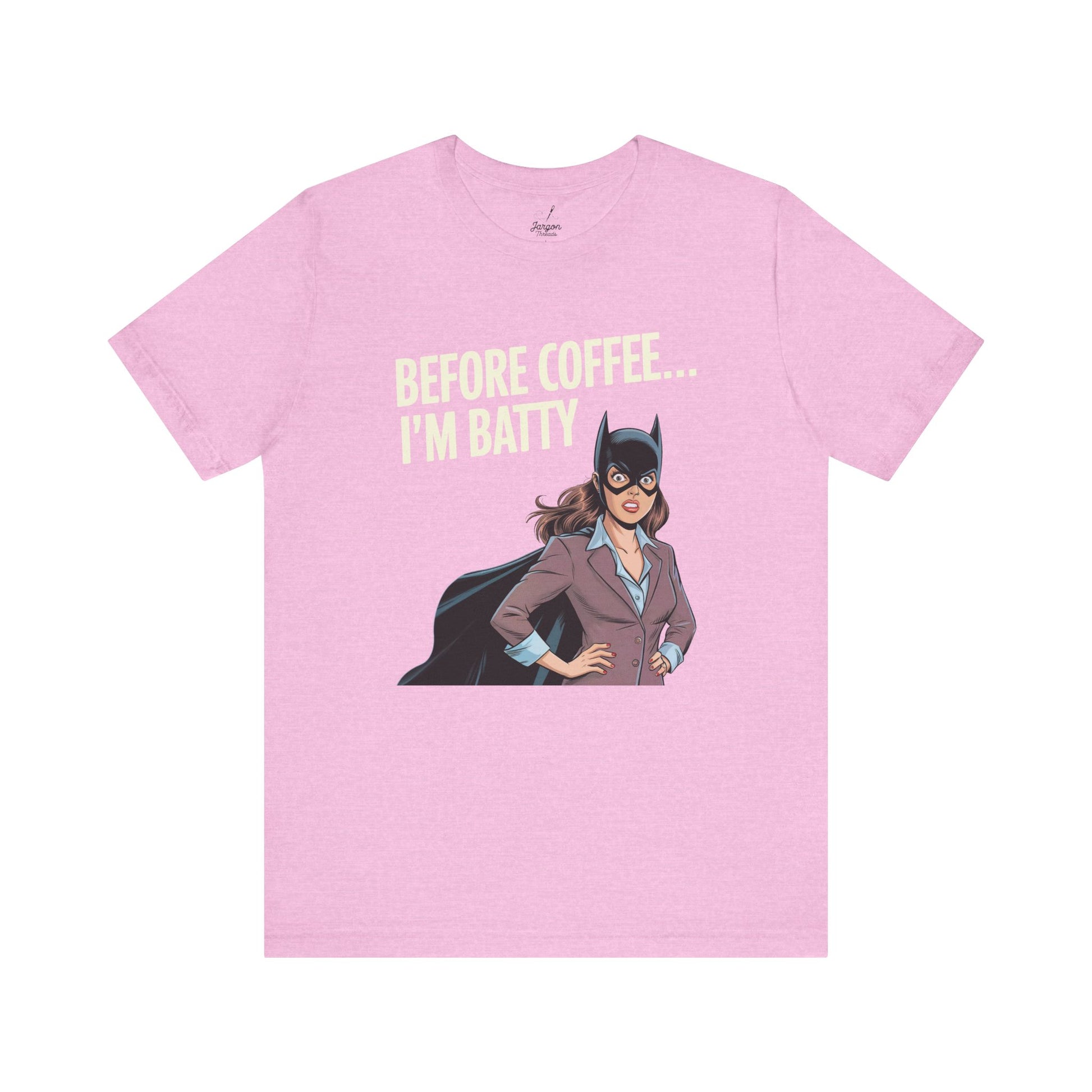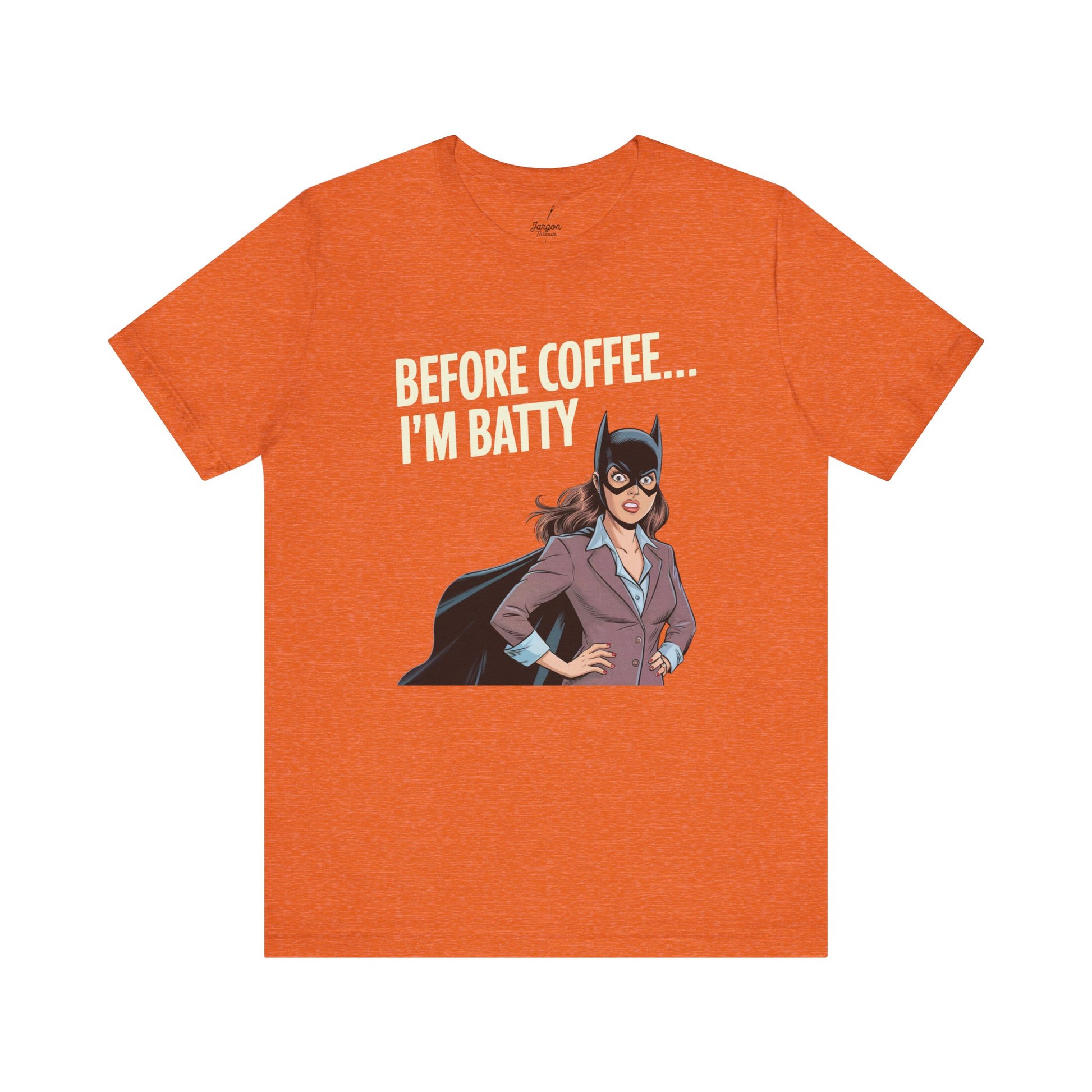 Before Coffee Im Batty T Shirt | Funny Business Woman Superhero Coffee Graphic Tee for Caffeine Lovers and Morning Mood Humor