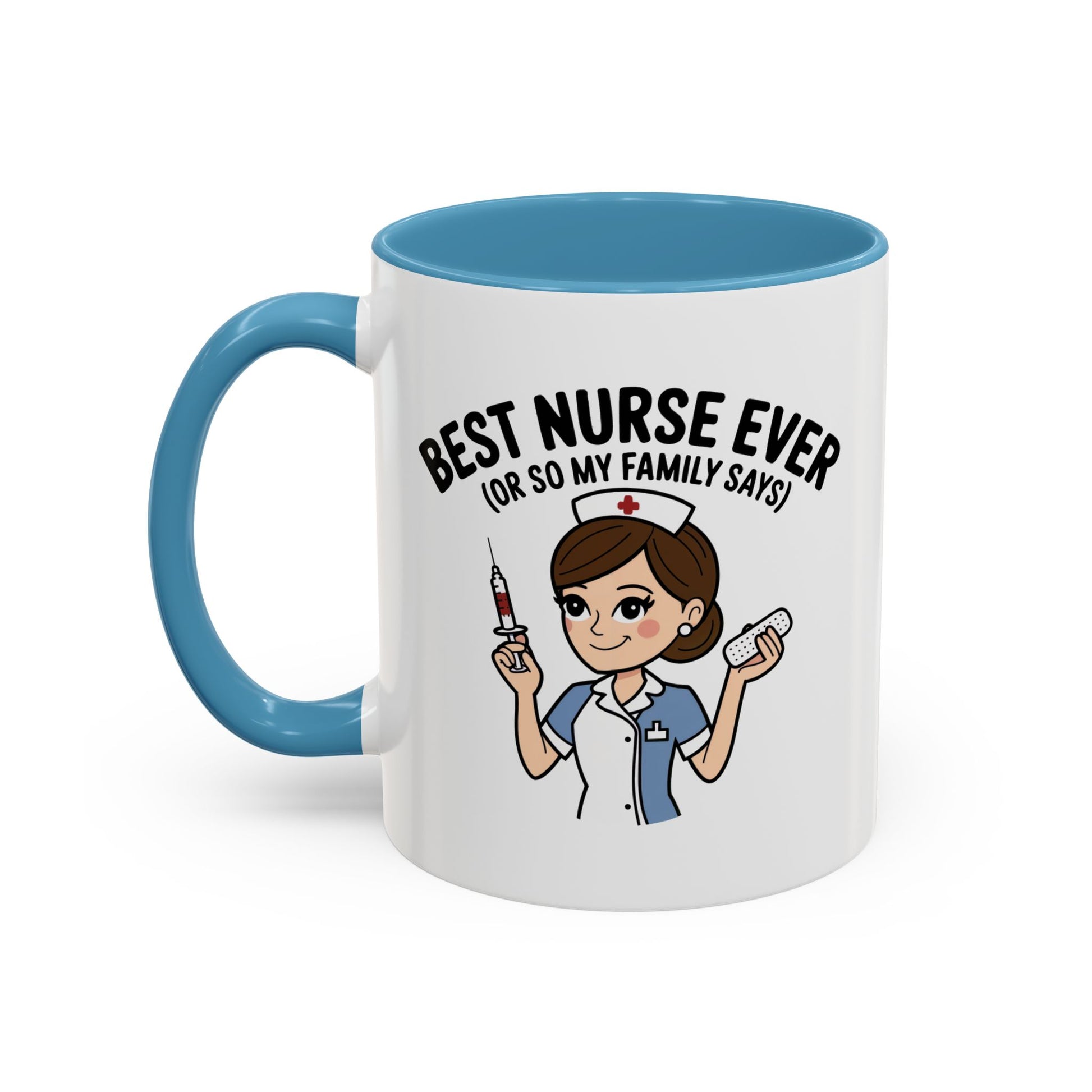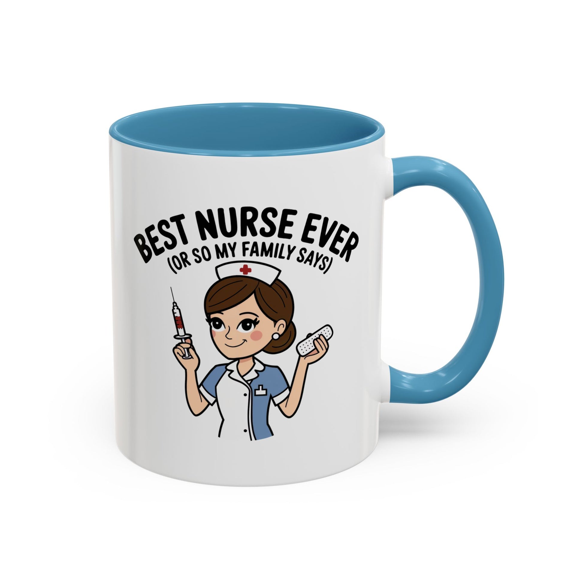 Celebrate the amazing nurse in your life with our charming Best Nurse Ever Mug! This 11oz mug, featuring a light blue handle and interior, is the perfect way to honor her hard work and dedication. The design showcases an illustration of a woman nurse with the playful phrase above, "Best Nurse Ever (or so my family says)."