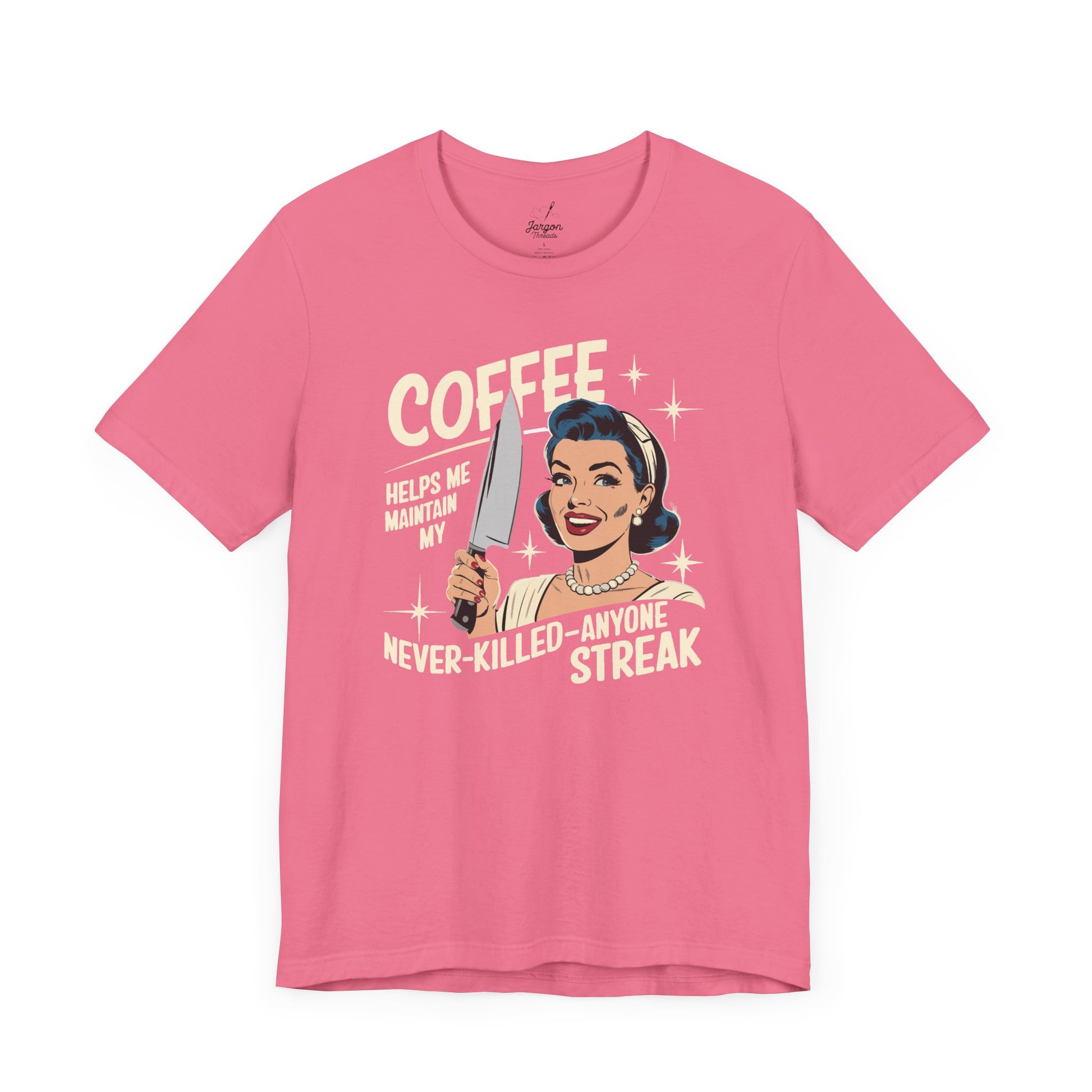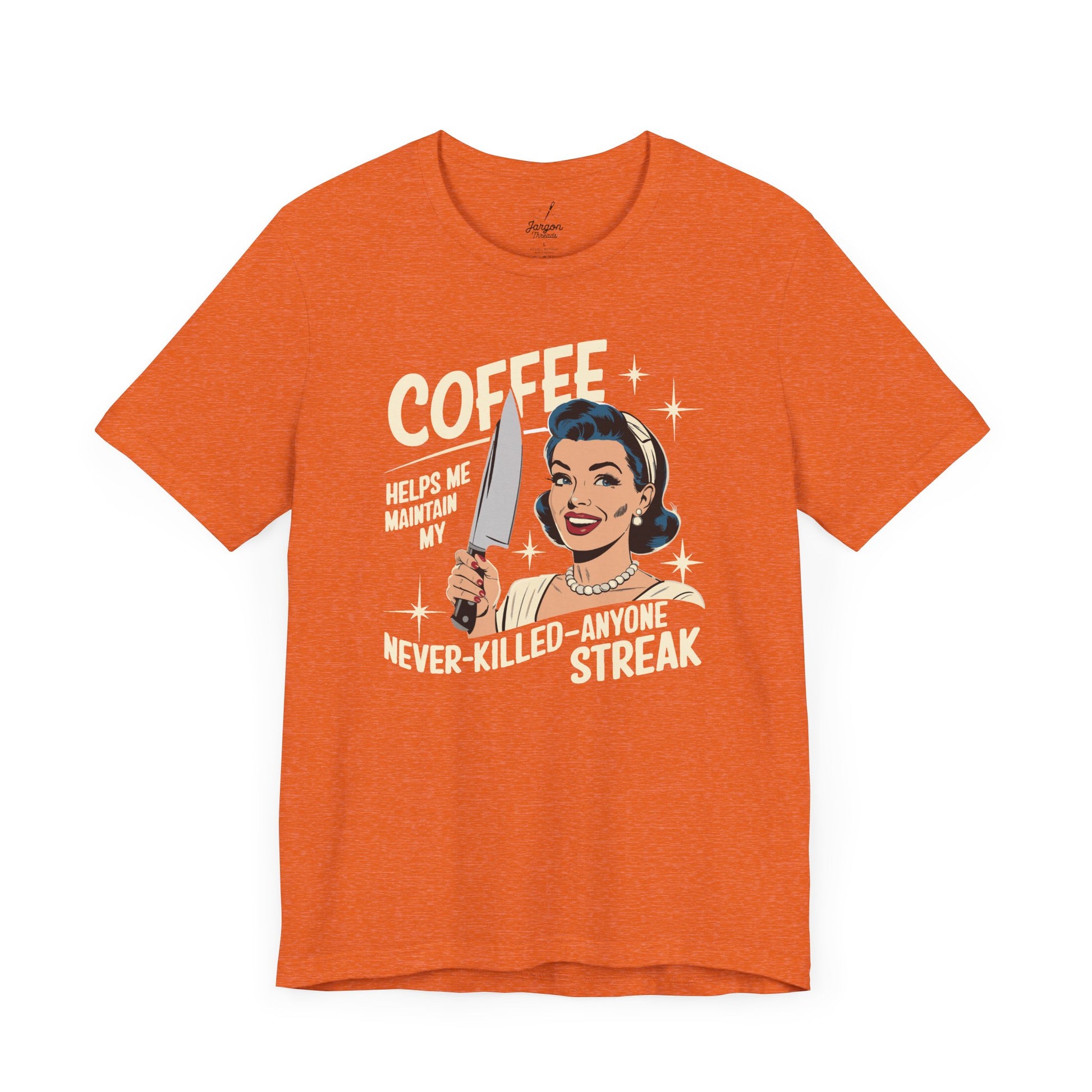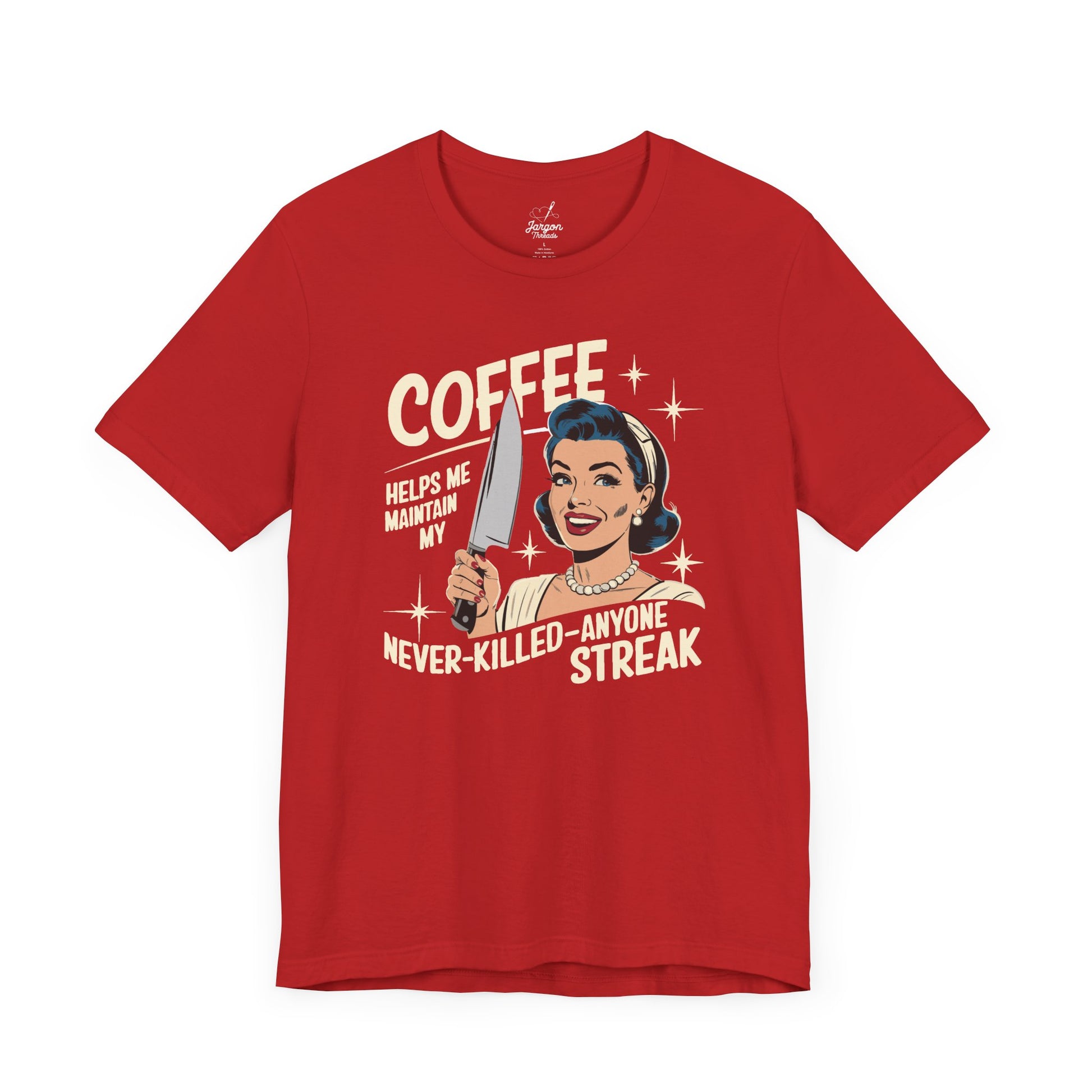 đ Product Description: Sharp knife. Sharper wit. This tee features a 1950s-style woman wielding a kitchen knife with the line: âCoffee helps me maintain my âNever Killed Anyoneâ streak.â It's the perfect blend of retro charm and dark humorâjust right for those who use caffeine to keep things civil.