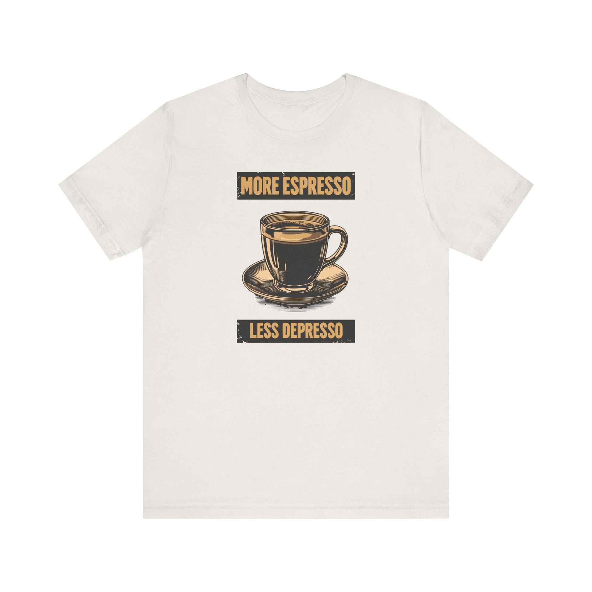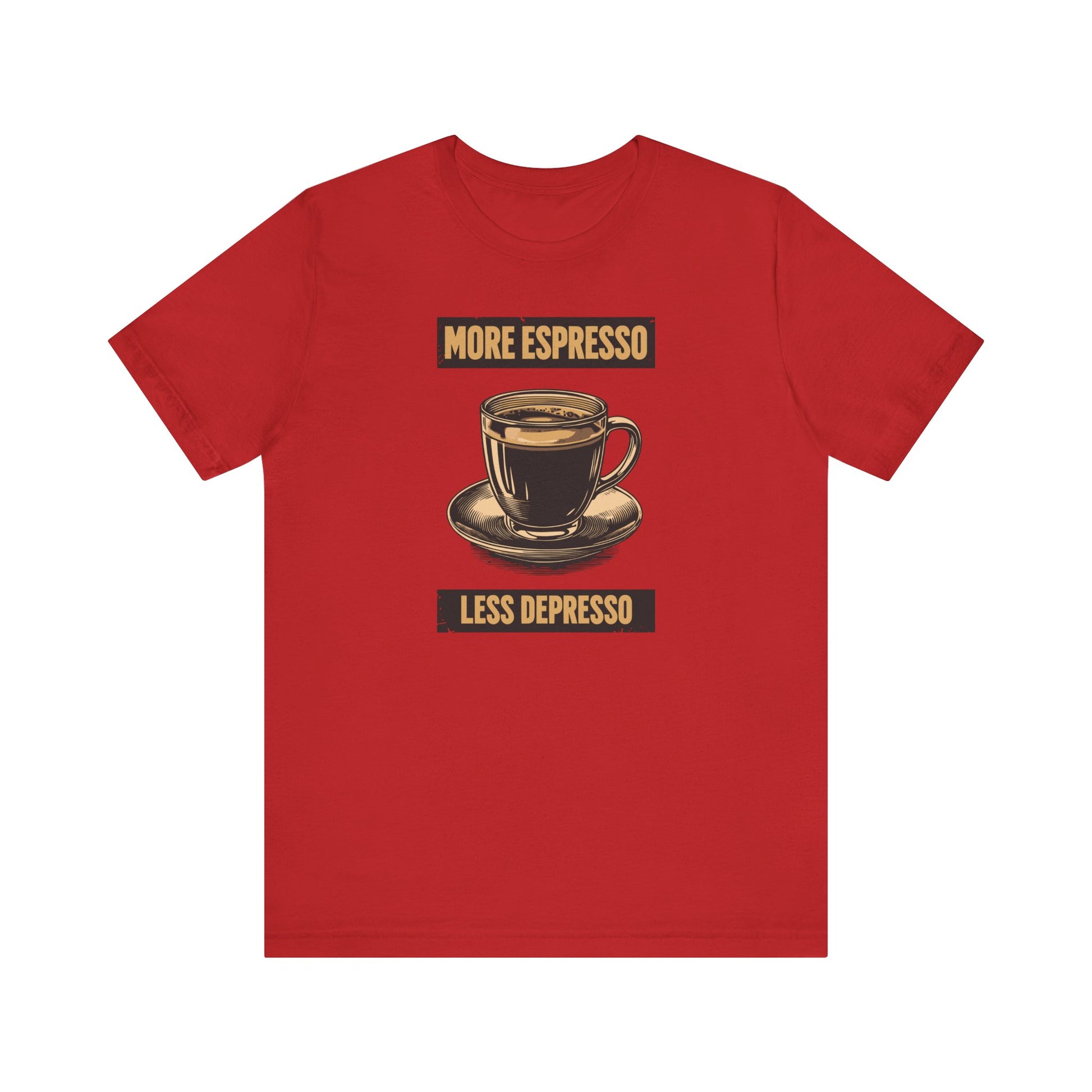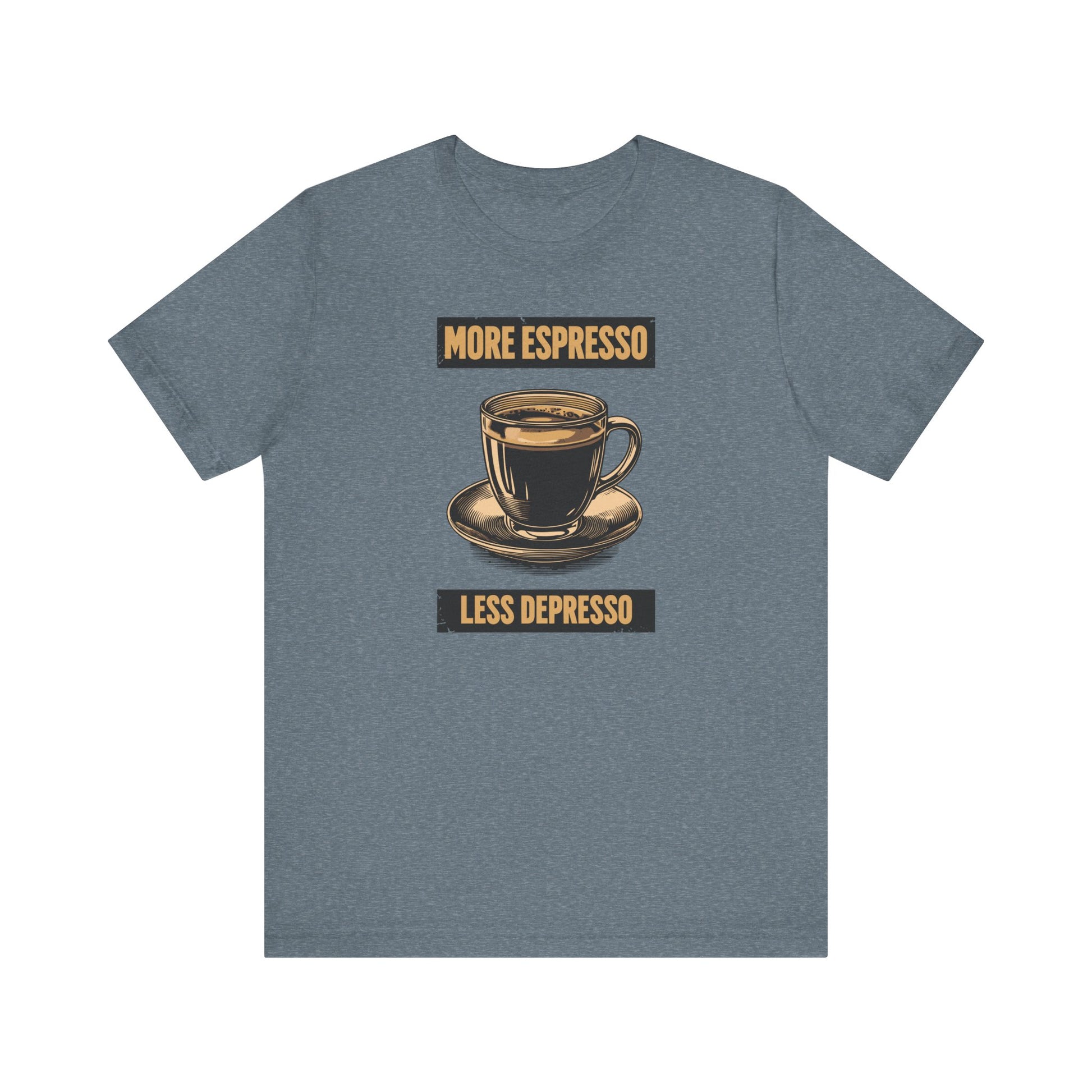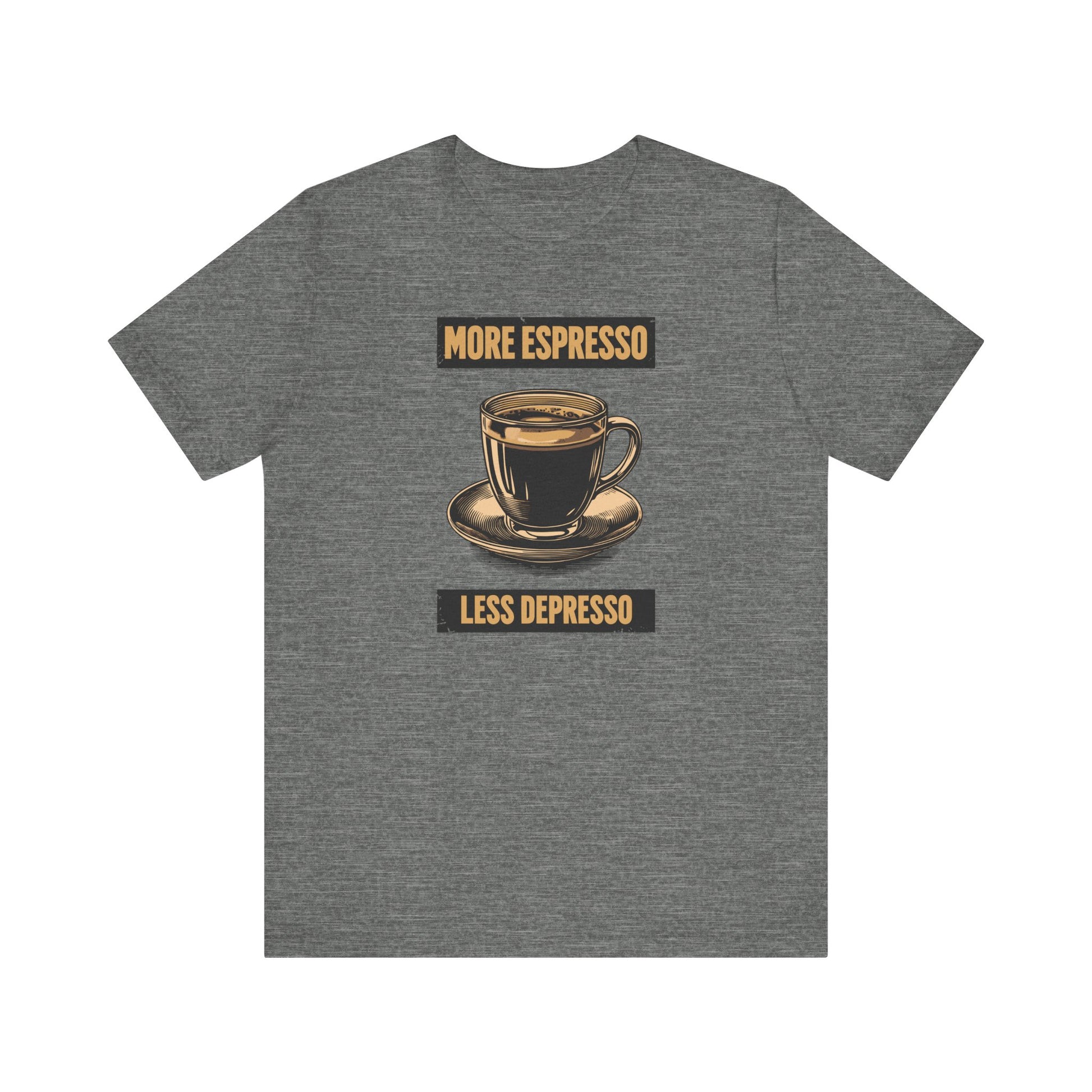 š Product Description: Sometimes all it takes is a strong shot of espresso to turn your day around. This cheeky tee delivers a daily dose of caffeine and comedy with the phrase More Espresso, Less Depressoāa must-have for coffee drinkers who use their morning brew as a mood stabilizer. Great for baristas, espresso snobs, and mental health warriors with a sense of humor. Available in 7 colors: Heather Orange, Heather Brown, Vintage White, Heather Slate, Red, Dark Gray Heather and Deep Heather