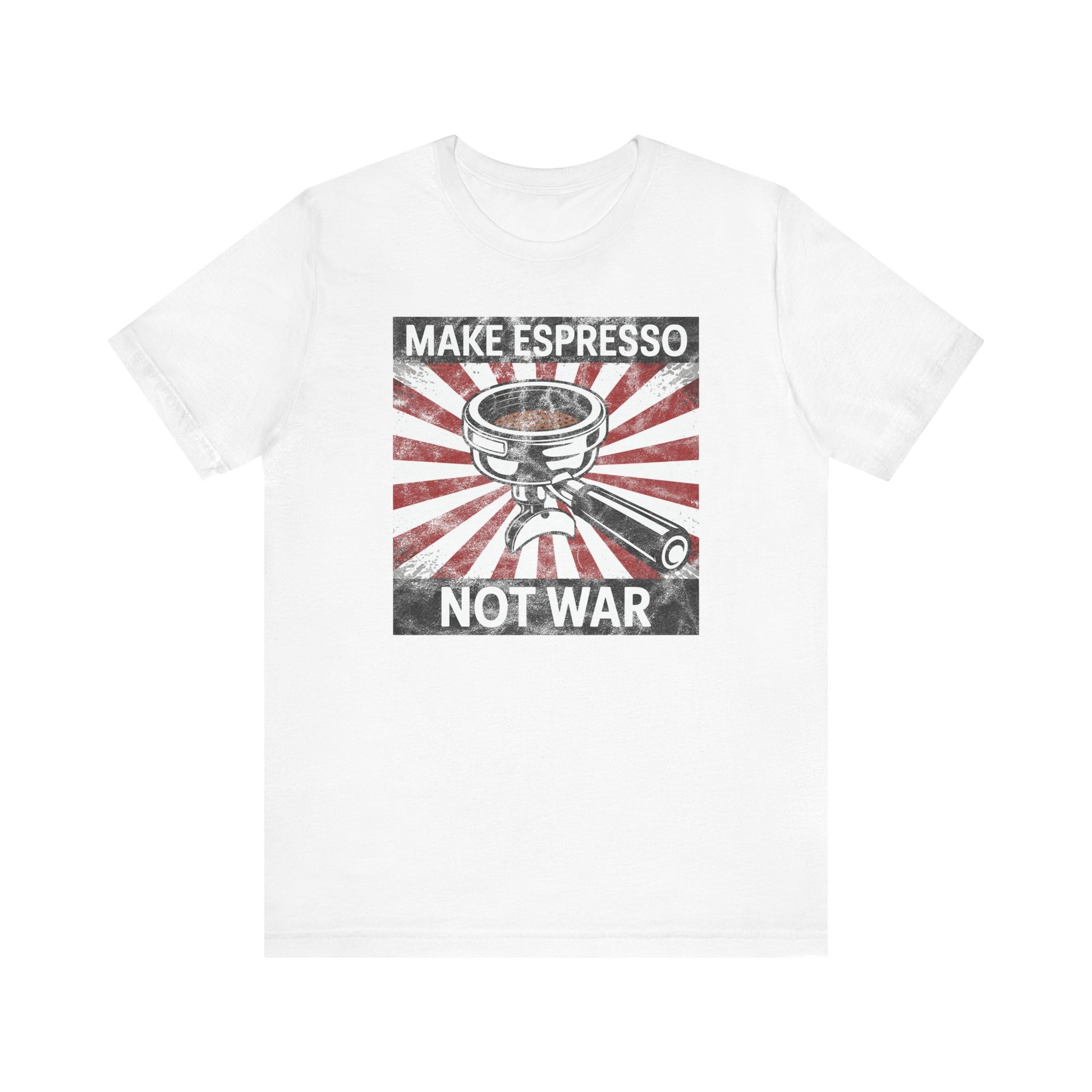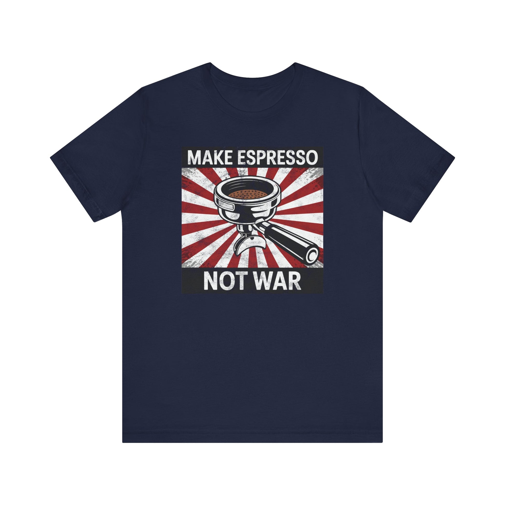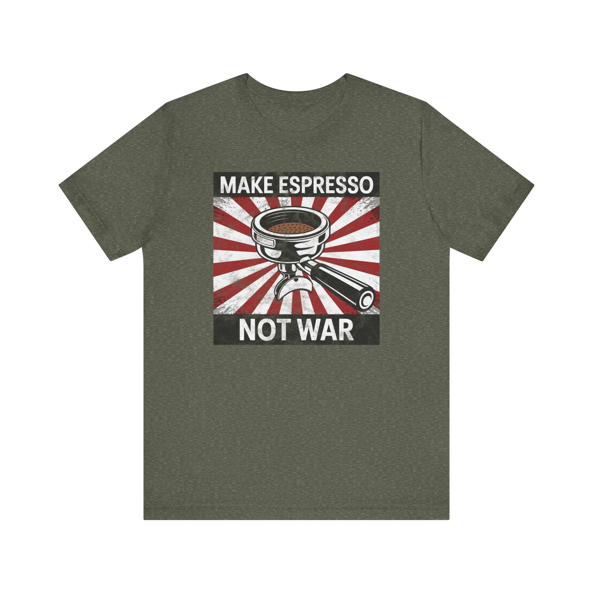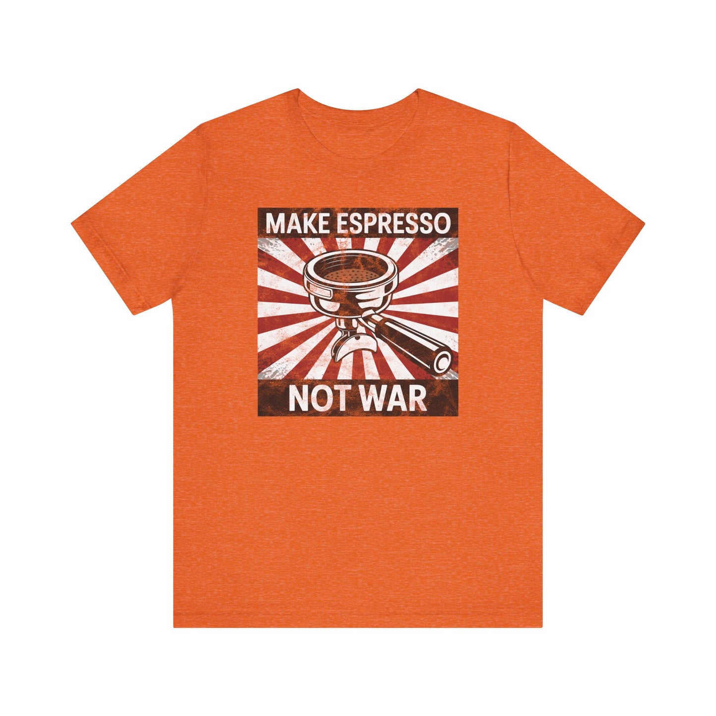 đ Product Description: Spread peace, not decaf. This retro-inspired Make Espresso Not War tee features a bold sunburst graphic and a vibe straight out of the 70sâperfect for coffee lovers, peaceful rebels, and anyone who believes espresso can fix more than just tired mornings. Itâs mellow, groovy, and fully caffeinated. Available in 6 colors: Vintage White, Heather Orange, Black, Dark Gray Heather, Navy and Heather Military Green