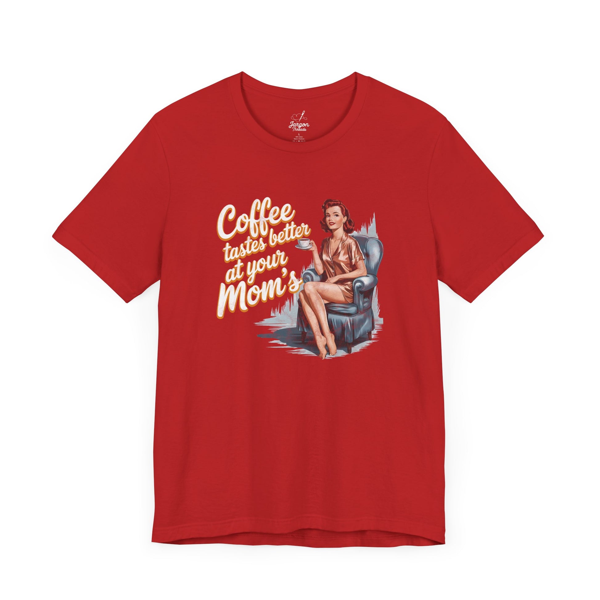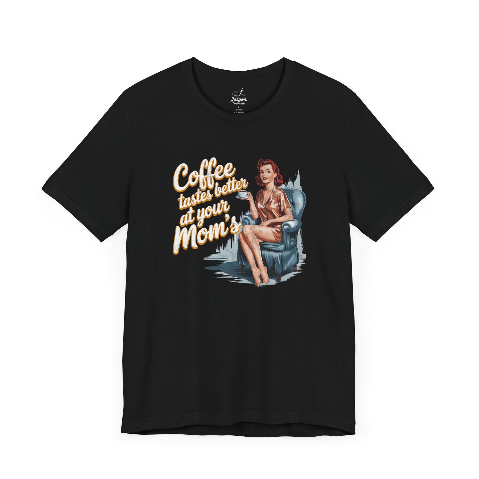 đ Product Description: Cheeky, retro, and just the right amount of bold. This vintage-style tee features a woman in her nightgown raising a mug with the phrase âCoffee tastes better at your momâs.â Itâs the perfect inside joke for the fellasâor anyone who enjoys a little playful sass with their morning brew.