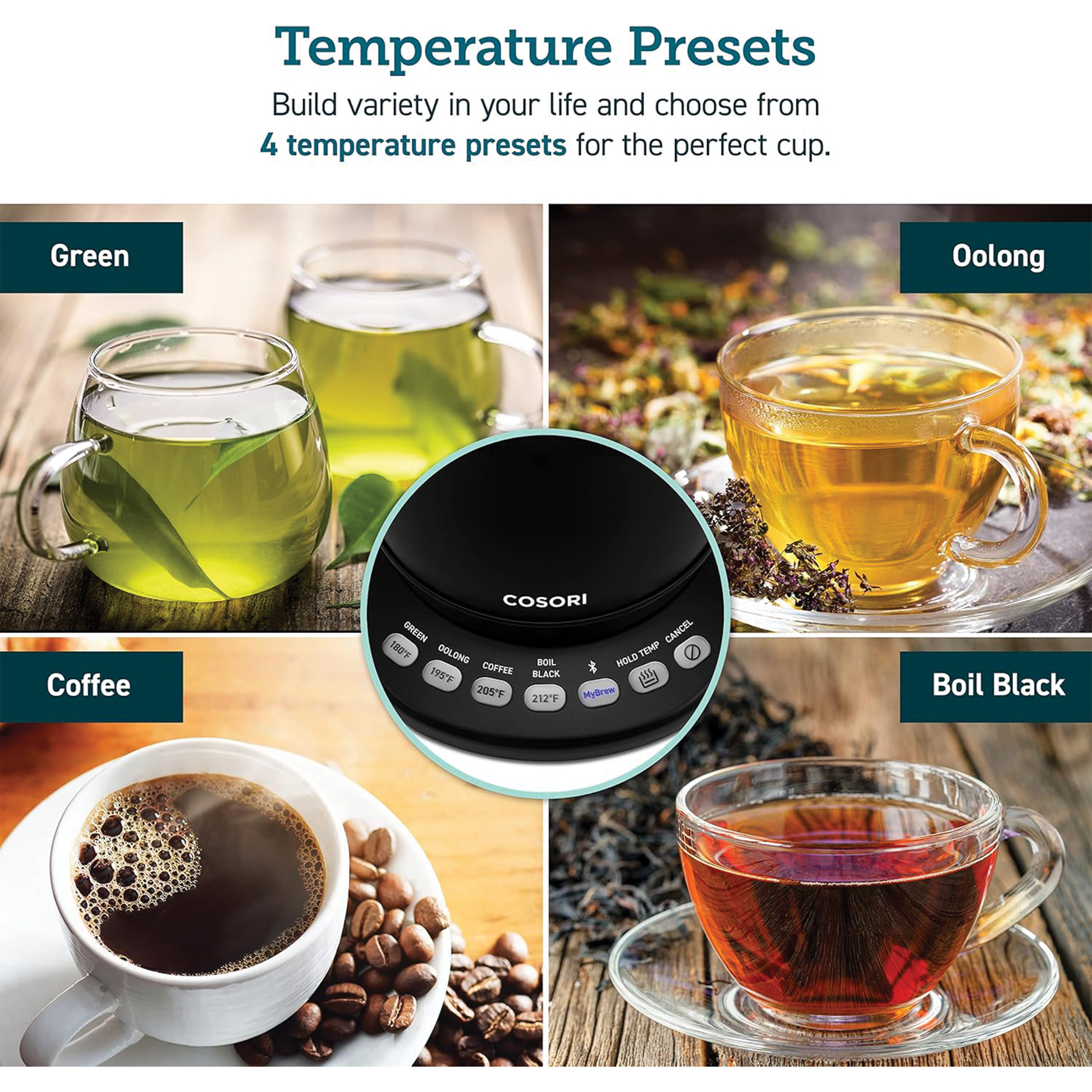 Precision meets simplicity with the COSORI Electric Gooseneck Kettle, the perfect companion for pour-over lovers and tea aficionados. Designed with five precise temperature presets, this 1200W powerhouse ensures your water is always at the ideal brewing temp — whether you're prepping delicate green tea or blooming your favorite coffee roast.