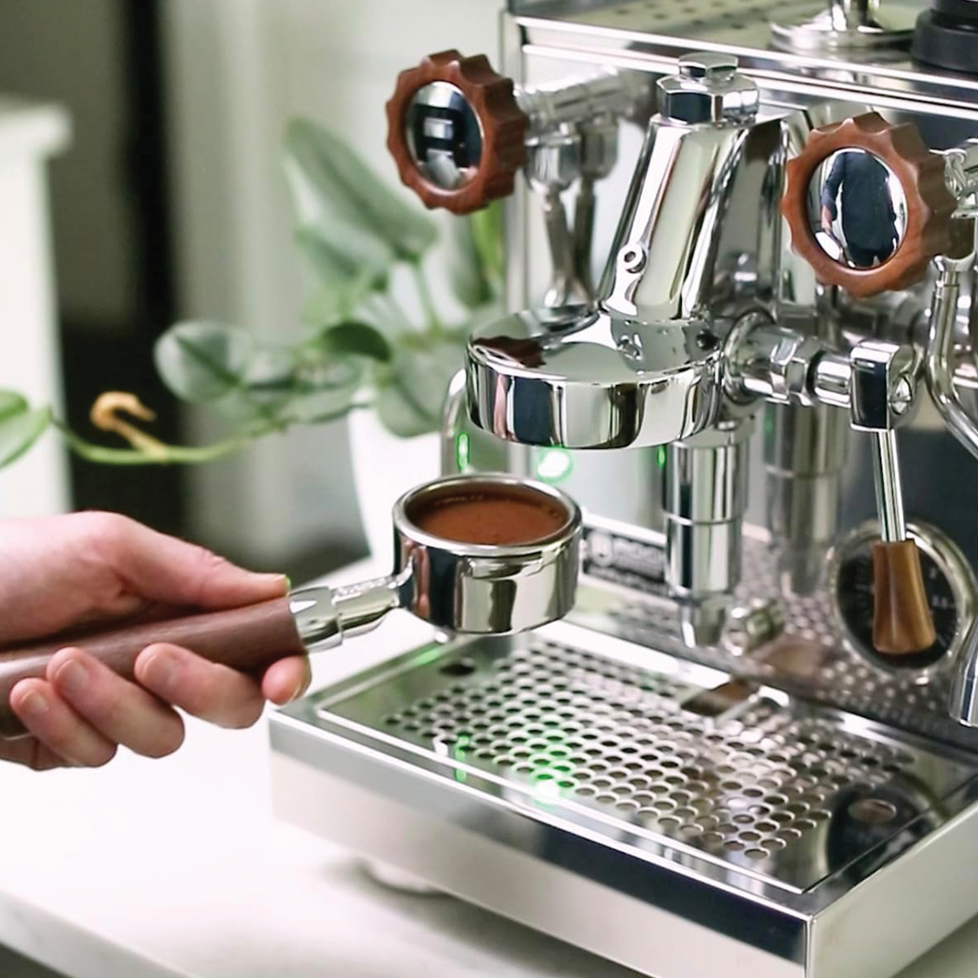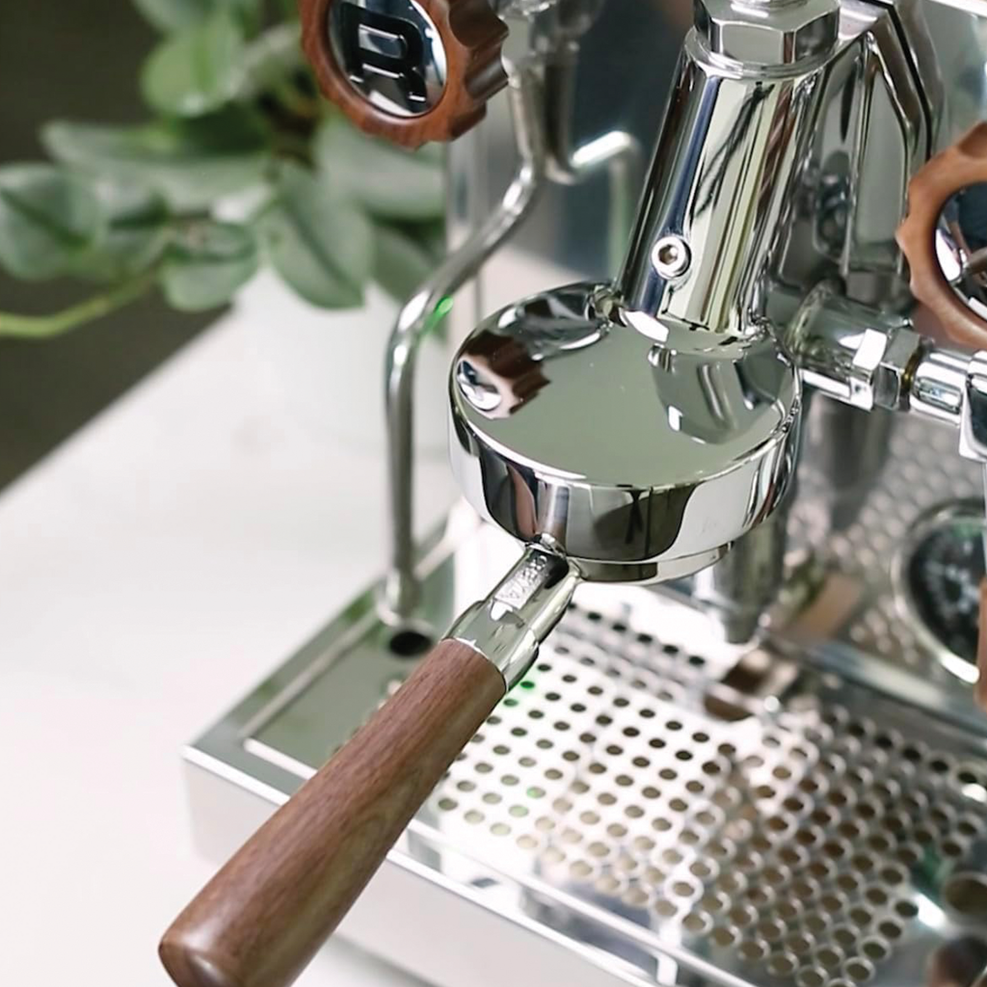 Crema 58mm Bottomless Portafilter | Walnut Handle | Fits E61 Group Heads