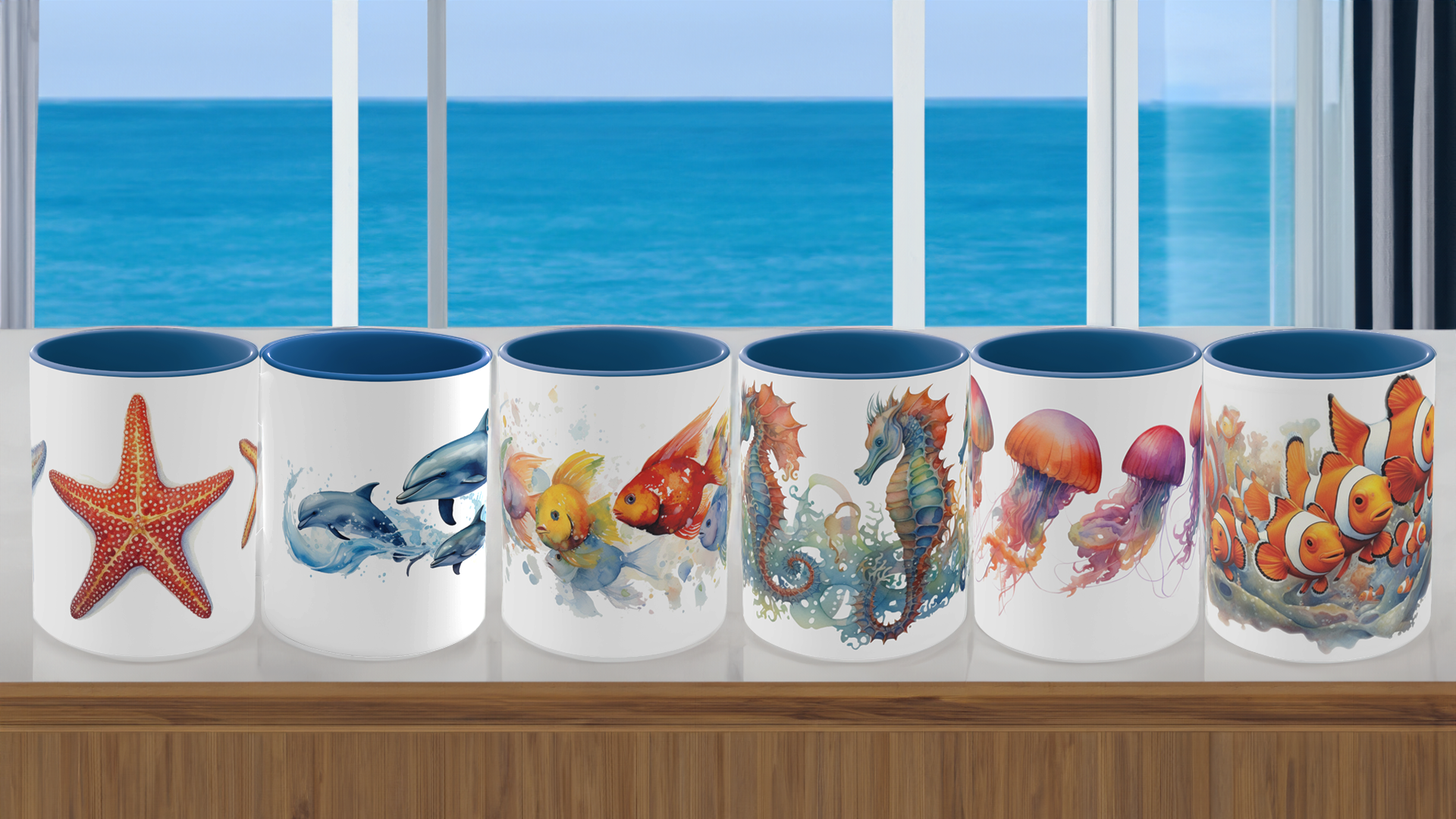 Introducing our "From the Sea" Mug Set, where every sip becomes an underwater adventure! This captivating collection features six 11oz mugs, each a canvas of marine magic. The white exteriors are complemented by mesmerizing blue interiors and handles, setting the stage for a sea-inspired spectacle. Dive into the intricately detailed world of sea creatures as you enjoy your favorite brews. From the graceful dolphins to the vibrant tropical fish, charming sea horses, whimsical jellyfish, iconic clownfish, and the ever-stunning starfish, each mug is a unique masterpiece that brings the wonders of the ocean to life. These mugs don't just hold your beverages; they transport you to a world of underwater enchantment. Crafted for both aesthetic appeal and daily durability, "From the Sea" Mug Set is a must-have for anyone who dreams of the ocean with every sip. Make your mornings extraordinary with this vibrant and detailed tribute to the wonders beneath the waves.