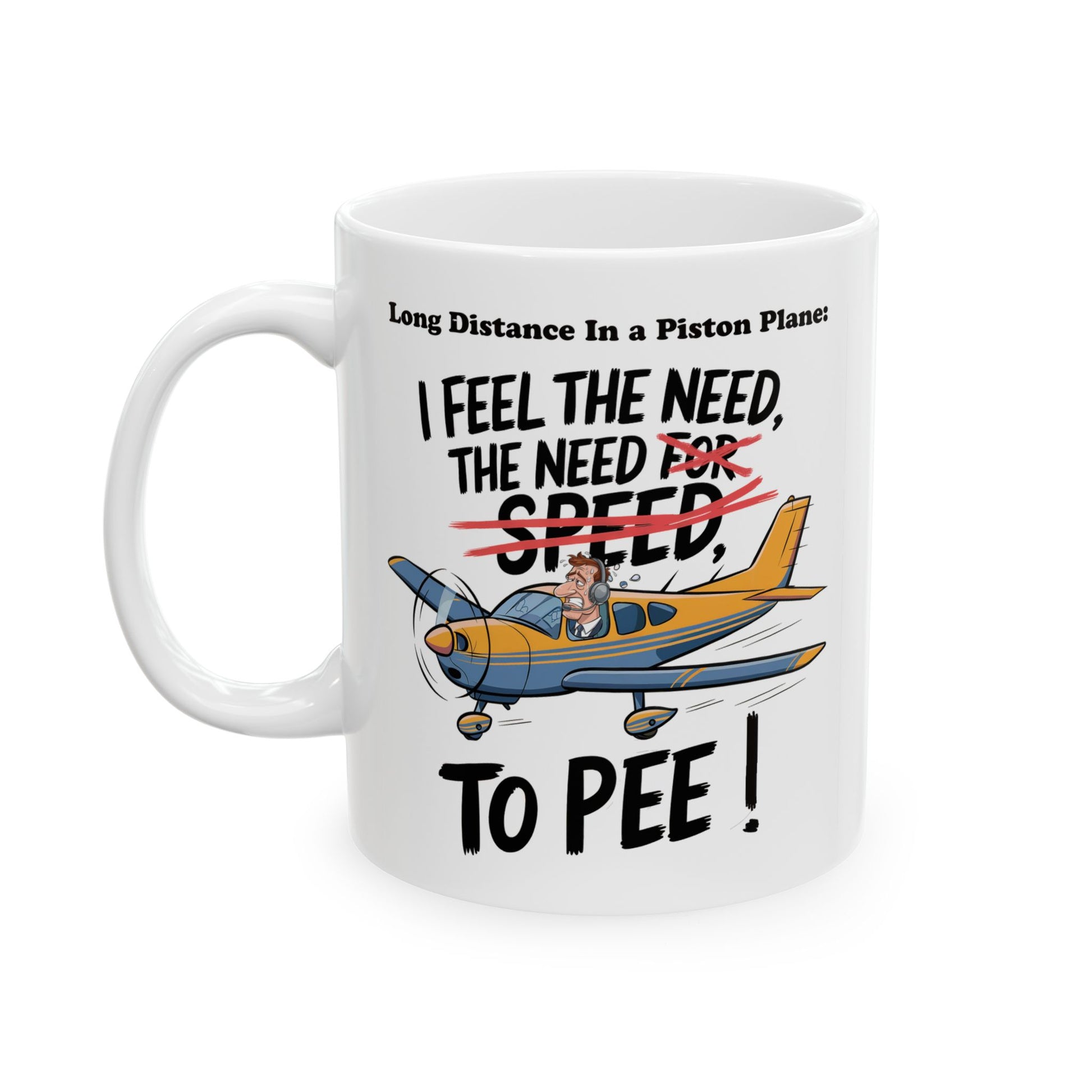 This funny quote mug is perfect for aviation enthusiasts with a sense of humor. The design features a small plane with a distressed pilot, and the phrase 'I feel the need, the need to pee.' This mug is ideal for daily use or as a gift for pilots, aviation fans, or Top Gun movie lovers. Perfect for birthdays, Father's Day, or any occasion where a good laugh is welcomed.