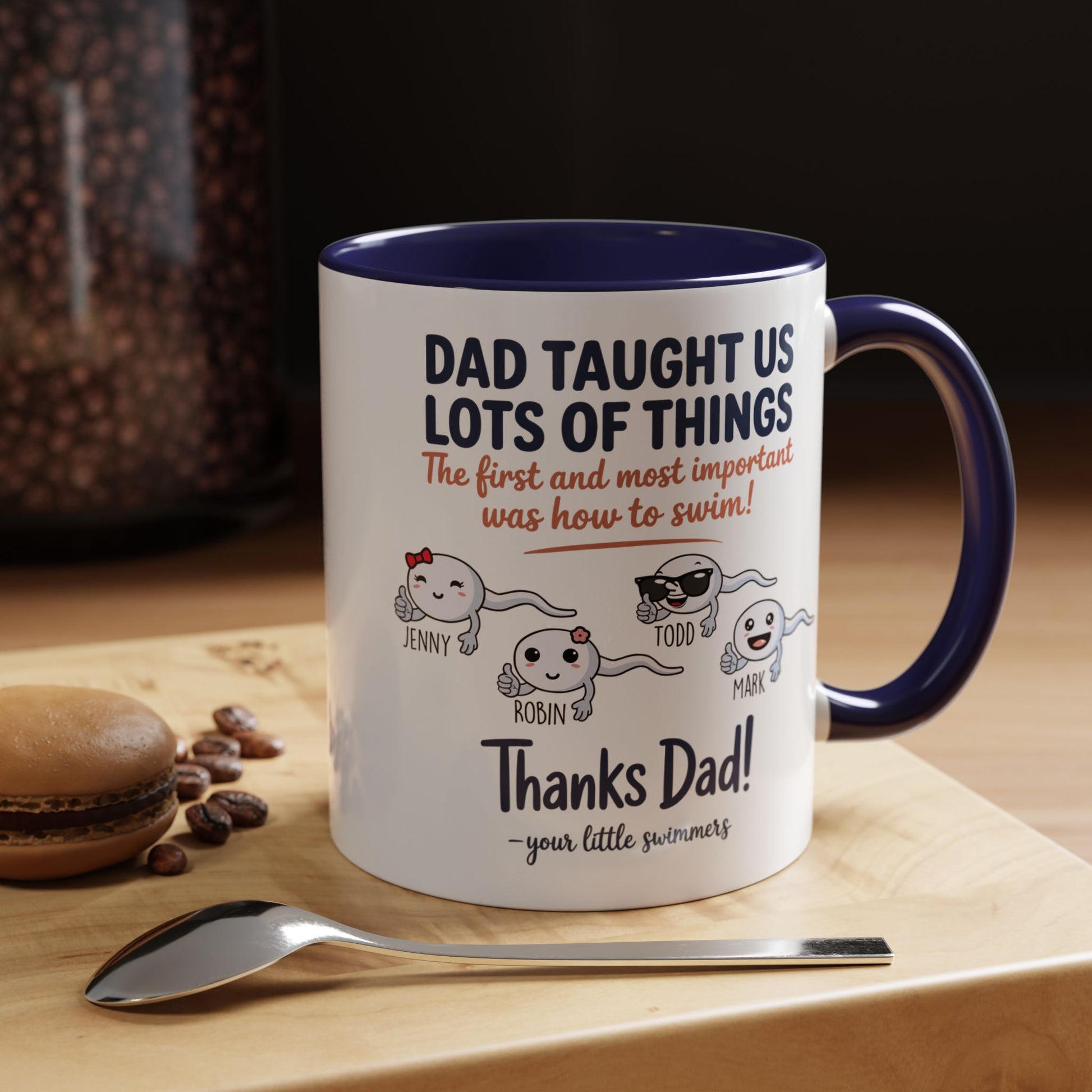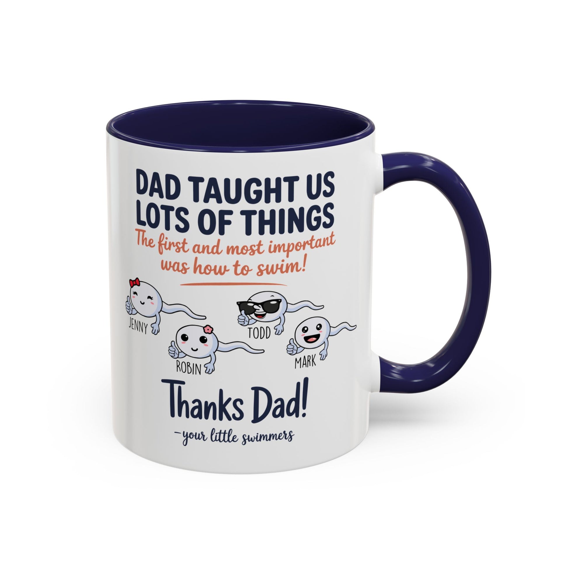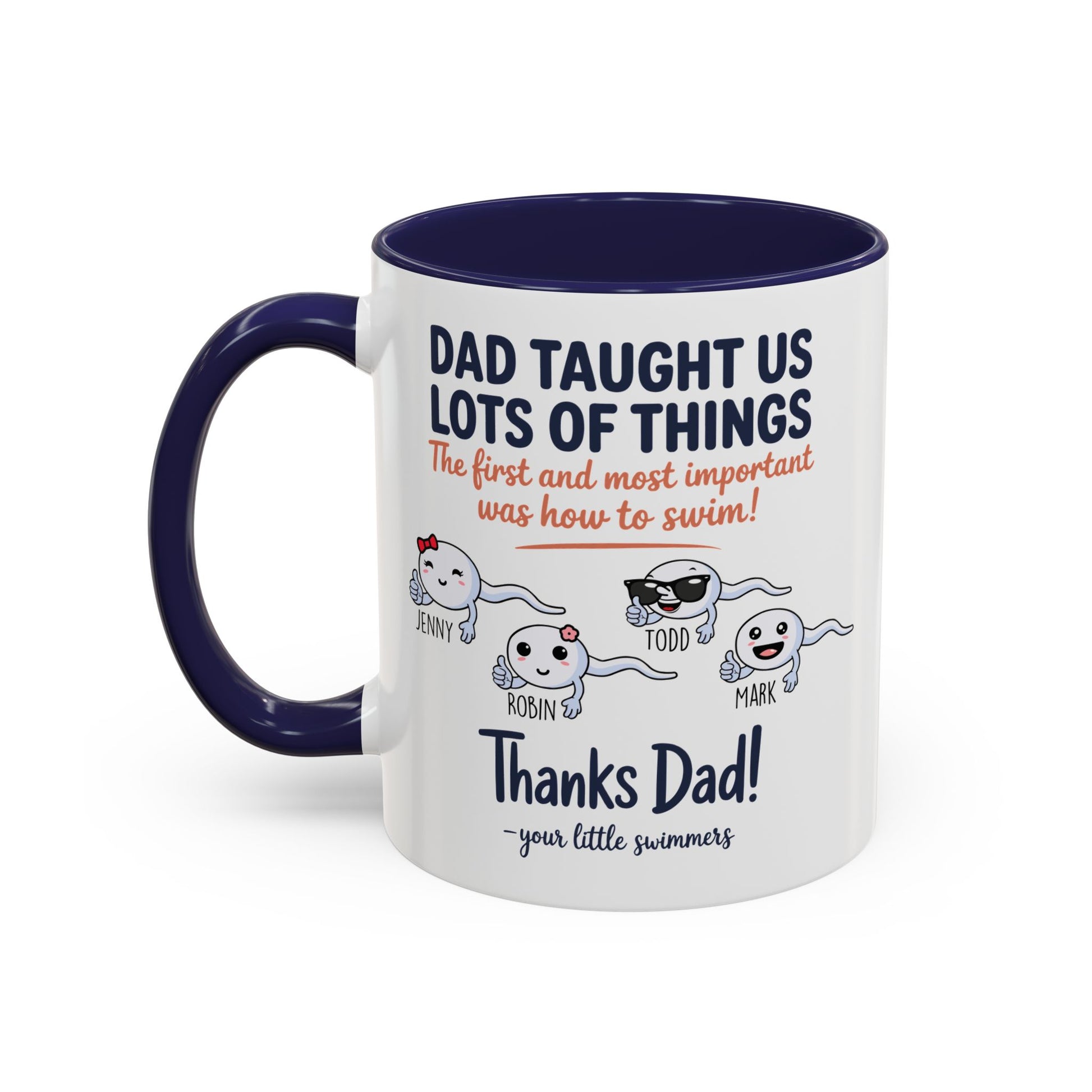Celebrate Dad with a hilarious and heartfelt keepsake! This 11oz ceramic mug features a navy handle and interior, the phrase “Dad Taught Us Lots of Things… The First and Most Important Was How to Swim,” and personalized cartoon sperm with each child's name below. Finished and 'signed' with “Thanks Dad! — your little swimmers.” Makes the perfect funny and personal Father’s Day gift!