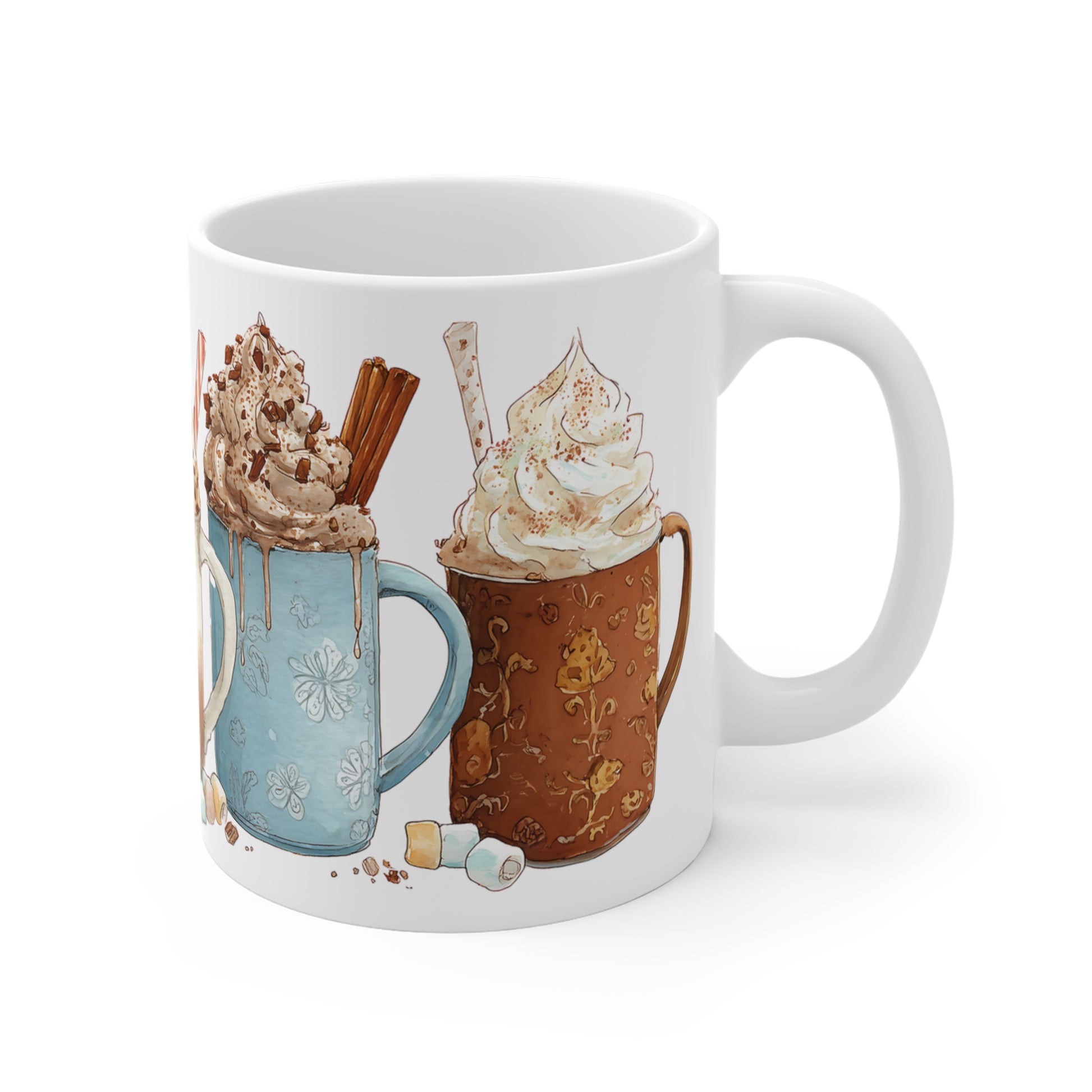 Whimsical mugs filled with cocoa, cream, and marshmallows are painted in festive detail. This design adds a touch of sweetness and nostalgia to your winter warm-ups.