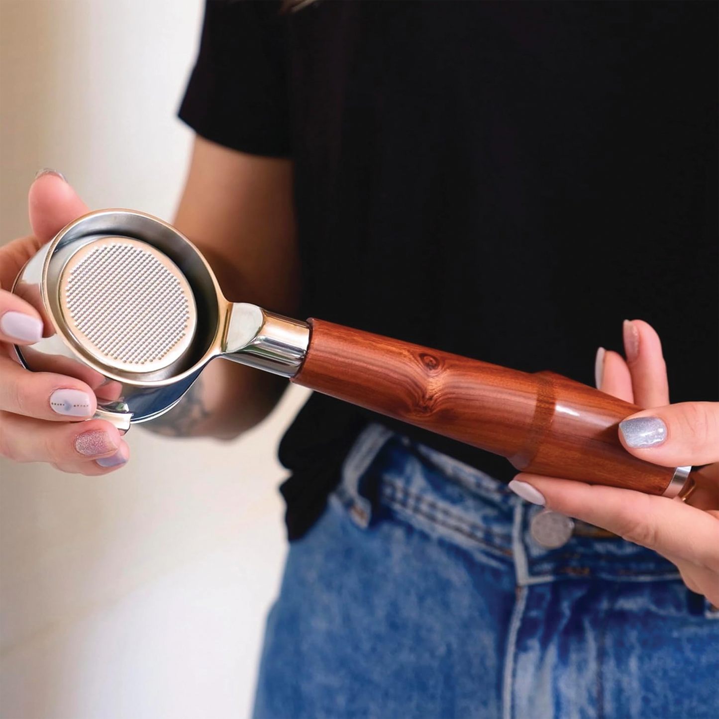 The Knodos 58mm Bottomless Portafilter is a precision-crafted tool designed specifically for Gaggia machines, including the Classic Pro, E24, GT, and Evo models. Featuring a beautiful rosewood handle and a durable, open-spout (naked) design, this portafilter offers real-time visibility of your espresso extraction—making it ideal for diagnosing channeling and perfecting your tamp. Comes with an included 18–21g filter basket for optimal shot consistency and performance.
