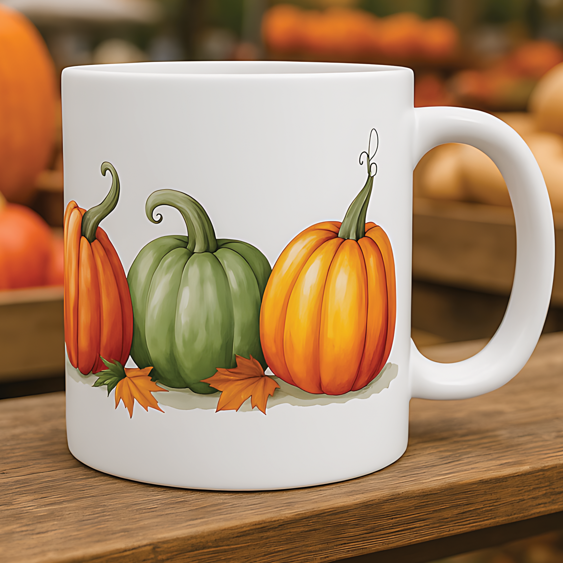 Classic watercolor pumpkins in rich green and orange tones celebrate the harvest season. A charming way to enjoy your daily brew while welcoming fall into your home.