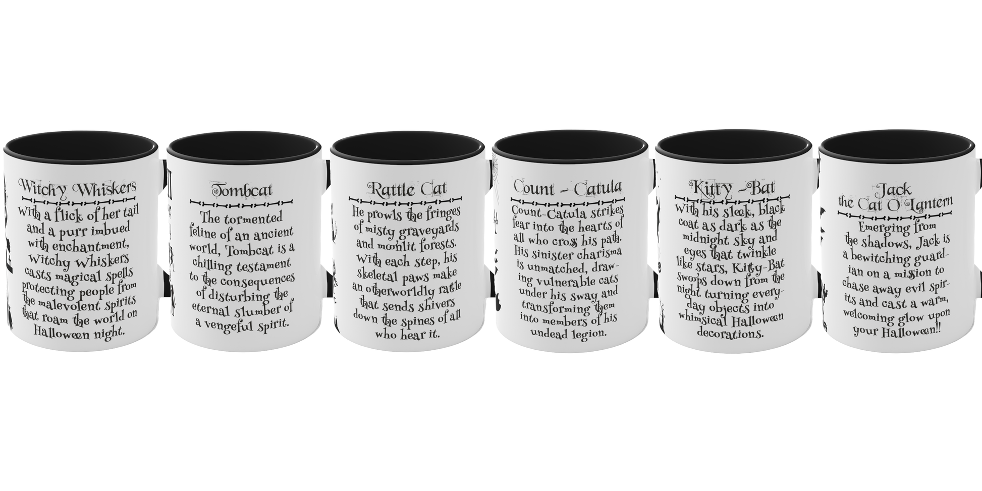 Each 11oz ceramic mug boasts a black accented interior and a sturdy black handle, adding a touch of sophistication and contrast to the whimsical cat designs. These mugs are perfect for sipping your favorite brews during the Halloween season or all year round. These are Java Jargon originals with each mug featuring the adorable characters and their background stories. On the spine of each mug are fun and playful iconic depictions of each characters personality.