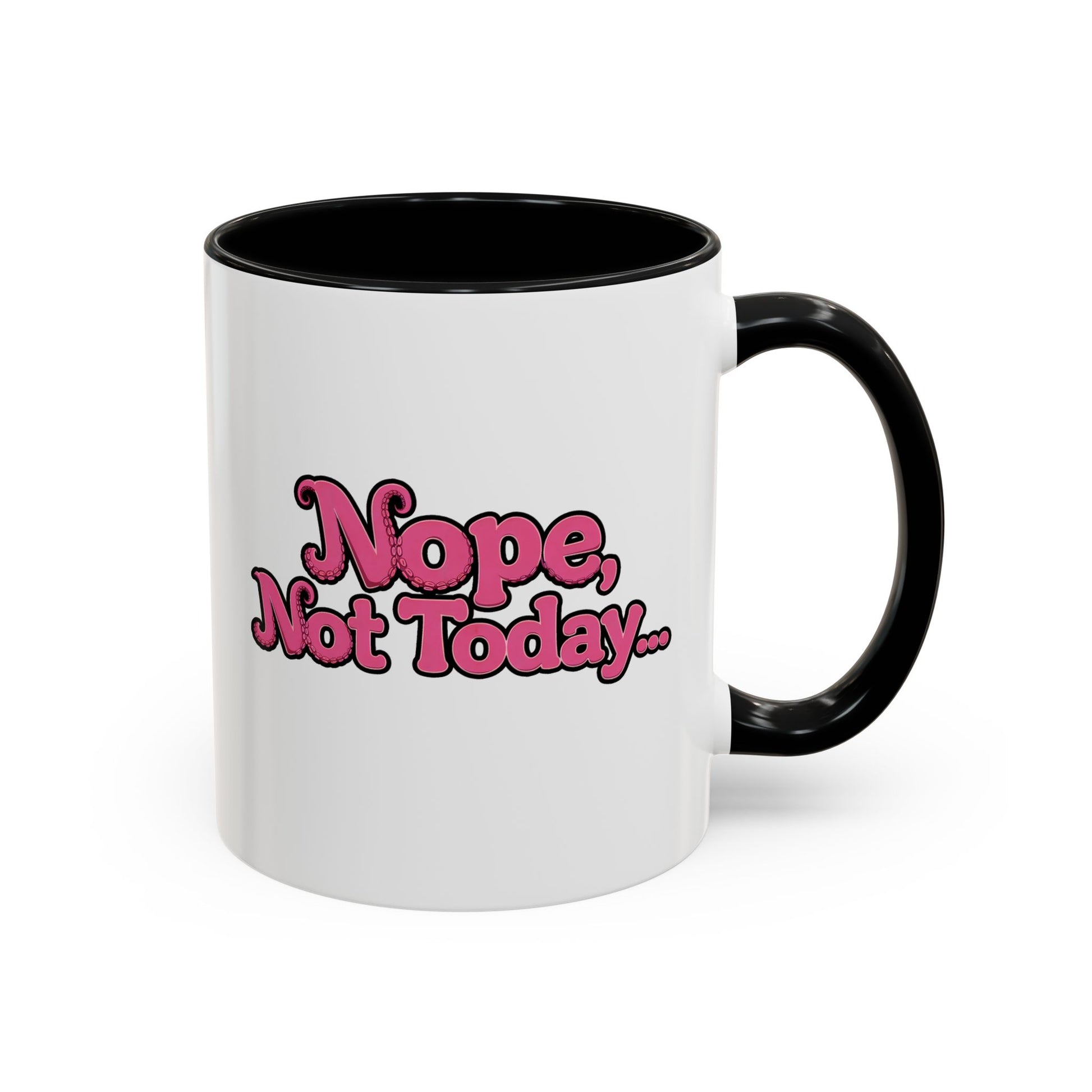 On the opposite side, you’ll find the phrase "Nope, not today," written in an eye-catching, Kraken-like font that adds an extra layer of fun to your drinkware. The contrast of the black handle and black interior enhances the vibrant colors of the octopus, making this mug a true standout.