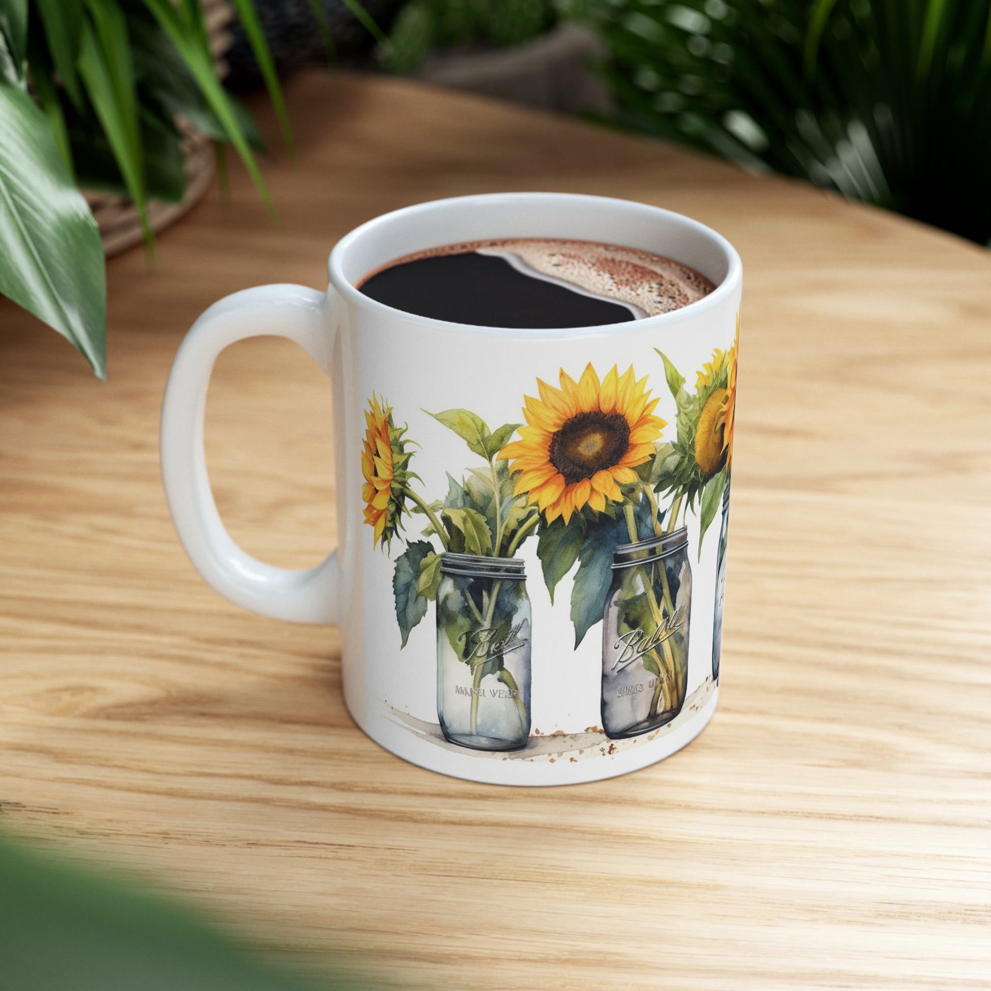 Whether you're enjoying a quiet moment alone or sharing a cup of warmth with loved ones, our Sunflower in a Mason Jar Coffee Mug is a charming addition to any beverage routine. It also makes a thoughtful gift for nature enthusiasts, art lovers, or anyone who appreciates the simple beauty of sunflowers.