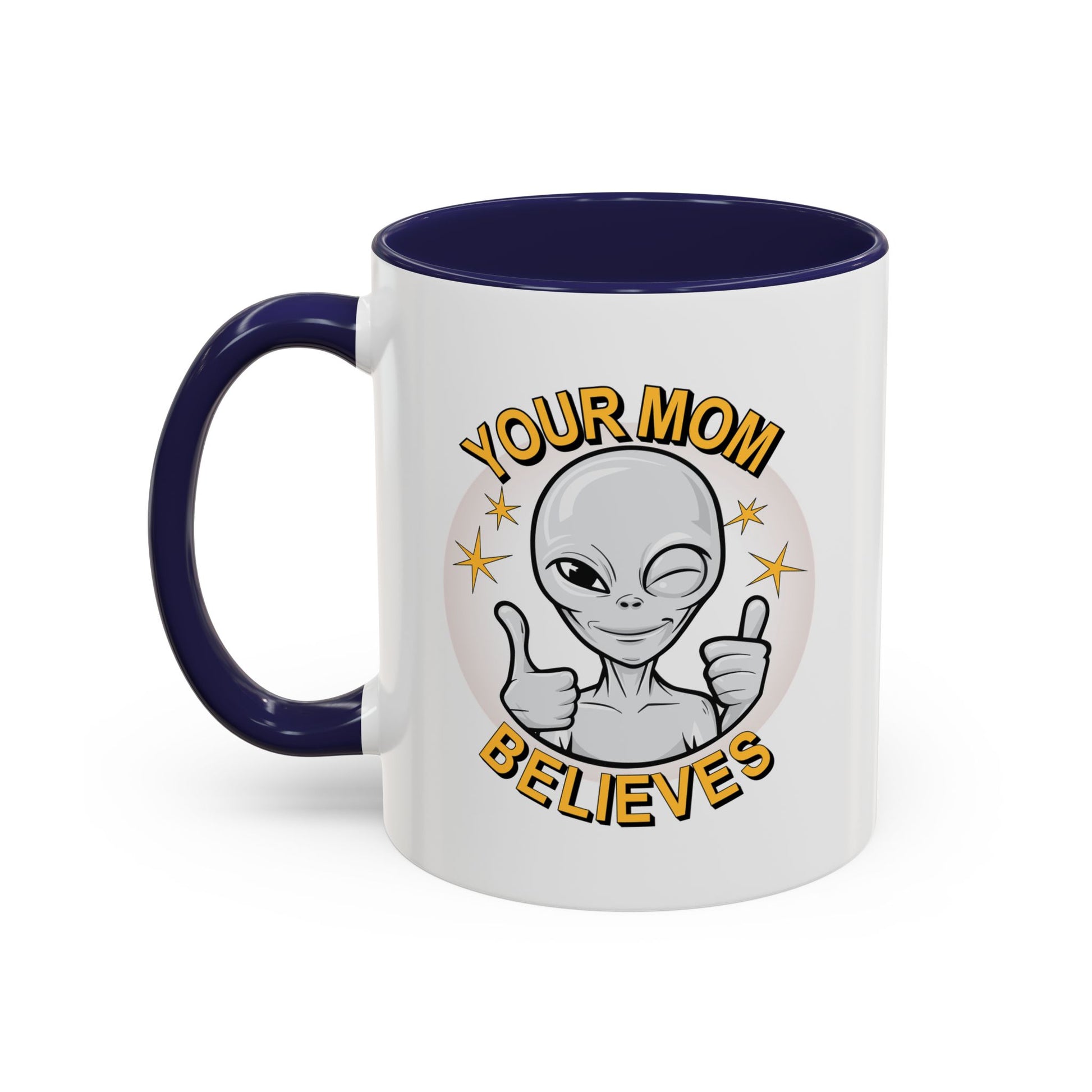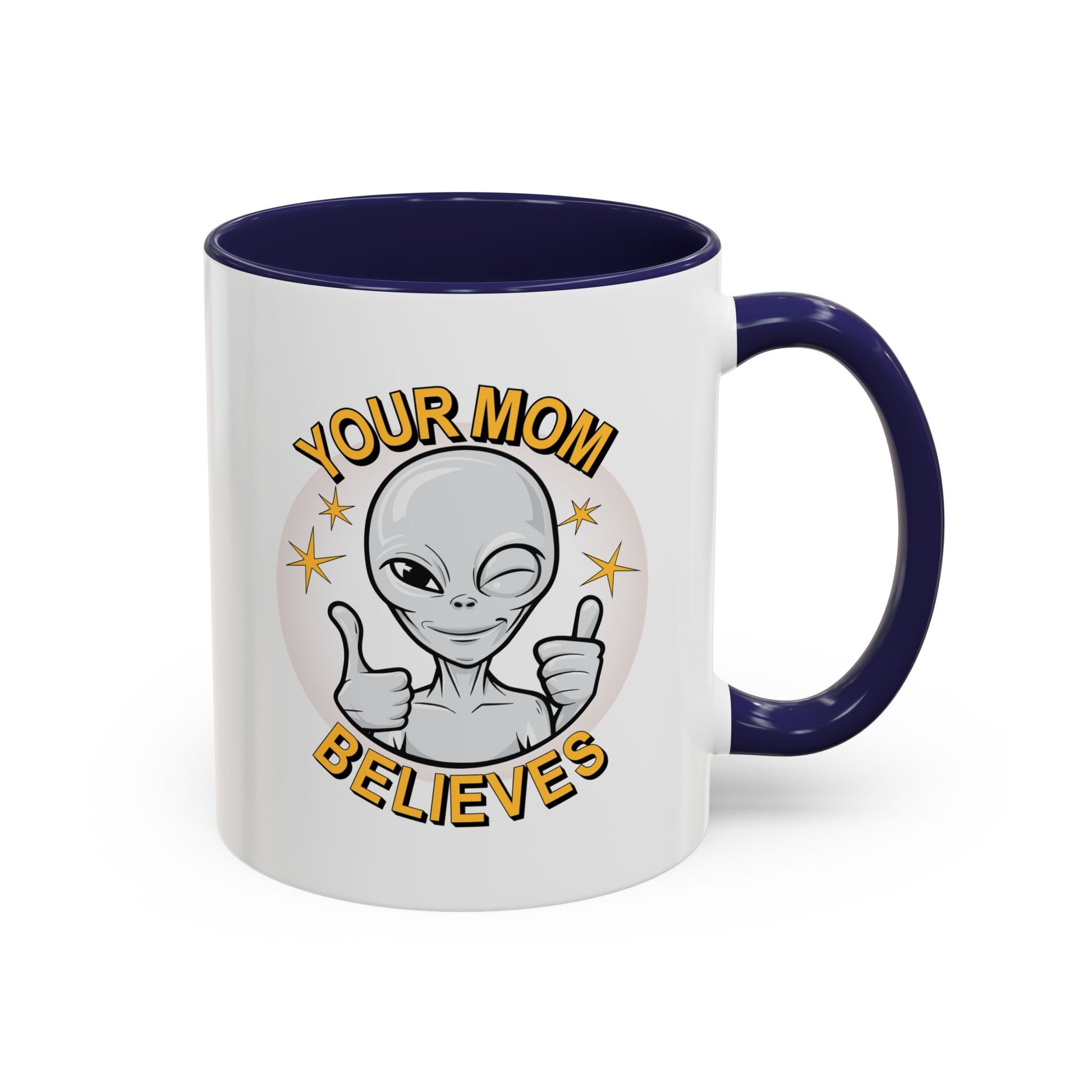 Get ready to blast off into laughter with our whimsical "Your Mom Believes" coffee mug! Featuring a cartoon alien winking and giving a thumbs-up, this mug brings a playful touch to your morning routine. The phrase hints at a lighthearted theory about extraterrestrial encounters and their amusing influence on Earth—because, let’s face it, the aliens have clearly been having their fun with the ladies of Earth!